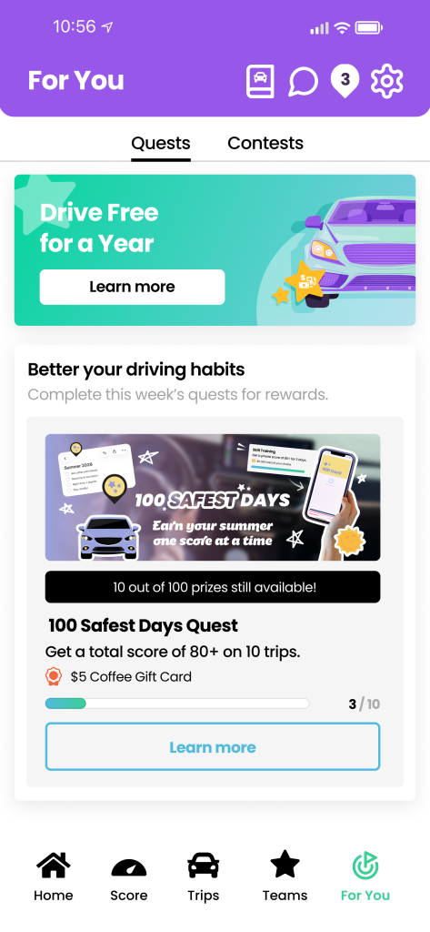 I like that it tells you what you need to improve on and that it tells you how fast you're going. I love the daily trivia and challenges for safer driving, and that you get rewarded for you safe driving! And that the company helps you learn and helps become a better and safe experience driver.